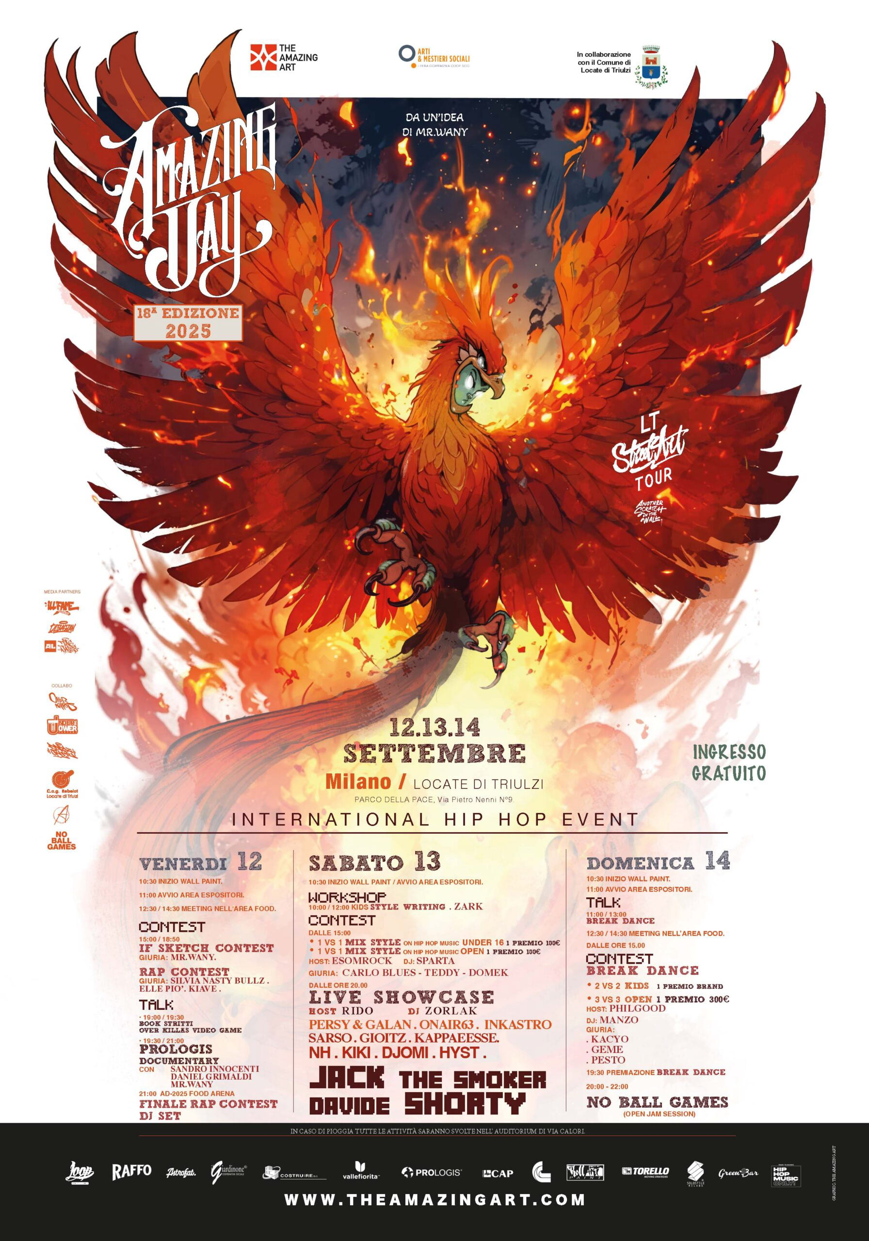 Si raduneranno sotto lo stesso cielo attività di street art – writing – art performance – dance – music – contest – talk – proiezioni video in una manifestazione diffusa e inclusiva che sarà il palcoscenico privilegiato della cultura di strada, con tanti nomi del panorama hip hop musicale italiano e grandi artisti internazionali visivi e il tutto a titolo completamente gratuito per il pubblico anche grazie alla collaborazione fra l’ideatore Mr.Wany fondatore di The Amazing Art e del Comune di Locate di Triulzi, la Cooperativa Arti e Mestieri Sociali ed il supporto degli sponsor.
